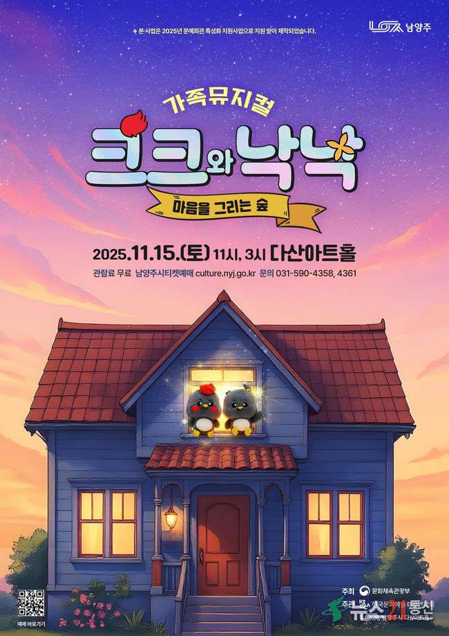 남양주시는 오는 11월 15일 다산아트홀에서 가족뮤지컬 ‘크크와 낙낙’을 선보인다고 28일 밝혔다. 이번 공연은 문화체육관광부가 주최하는 ‘2025년 문예회관 특성화 지원사업’ 신작제작형 공모에 최종 선정된 작품으로, 남양주시와 한국문화예술회관연합회가 공동 주관한다.