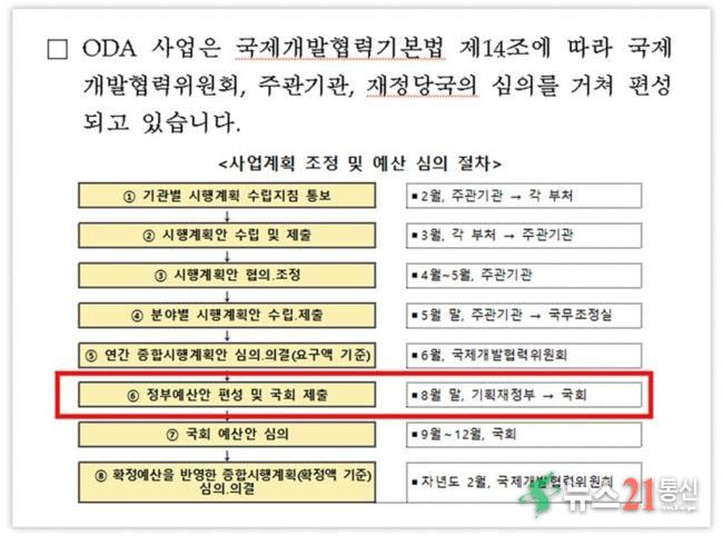 아울러 "국제개발협력위원회에 들어있지 않은 사업이 정부 예산안에 편성된 것을 확인했다"면서 "기획재정부에서 국무조정실 국제개발협력위원회를 거치지 않고, 예산실에 곧바로 제출을 한 것 같다"고도 말했다.