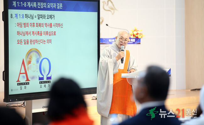 지난해 신천지 청주교회에서 열린 제2기 만국초청 계시록 특강에 불교 종교지도자로 참석한 현산 스님이 그간 배운 계시록에 대한 내용 중 요한계시록 1장 1절에서 8절의 내용으로 스피치하는 모습.