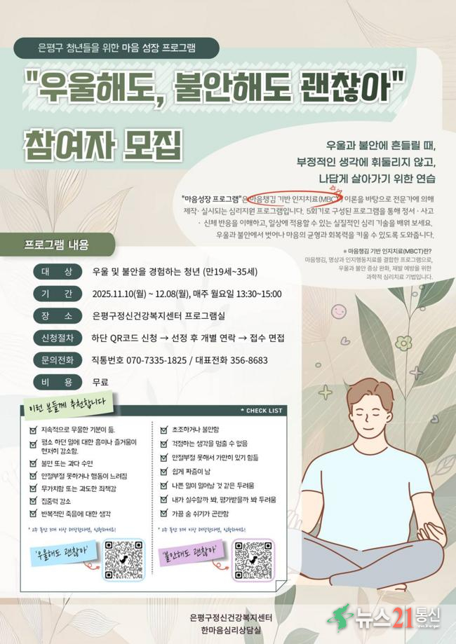 서울 은평구(구청장 김미경)는 청년들의 마음 성장 프로그램인 ‘우울해도, 불안해도 괜찮아’ 참여자를 모집한다고 밝혔다.