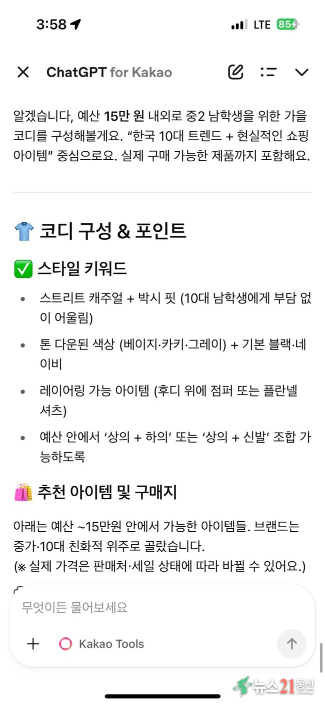 정보 탐색과 구매가 대화창 안에서 일체화되며 쇼핑 접근성도 높아졌다. 40대 주부 박모씨는 자녀의 옷을 사기 위해 챗GPT에 “10대 사이 올가을 유행하는 옷과 구매 장소”를 물었다. AI는 트렌드와 함께 “베이지·그레이·먹색 계열 후드, 트랙 재킷, 와이드 데님” 등 핵심 스타일을 제시했다. 대표 브랜드와 가격대도 함께 제시돼 선택이 쉬워졌다. 박씨는 “‘최근엔 OOO 운동화가 여학생 필수템’, ‘캐릭터 프린팅보단 단색 로고가 인기’ 같은 팁이 유용했다”며 “중2 남학생, 예산 등 구체적 조건을 입력하니 쇼핑 리스트와 링크 중심의 맞춤 코디까지 만들어줬다”고 말했다.