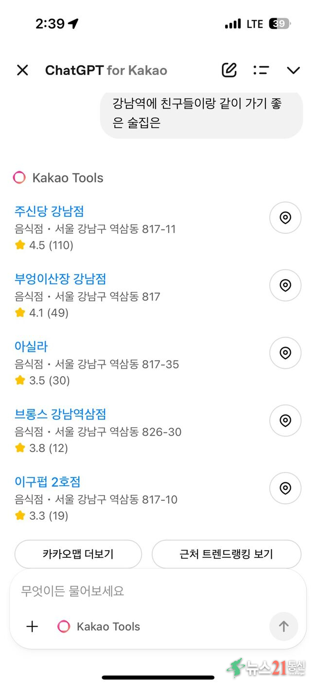 지도 정보와도 연동돼 카카오맵으로 위치를 바로 확인하고, 길찾기·리뷰·예약 정보까지 함께 확인이 가능했다. 김씨는 “회식장소 정하는 게 생각보다 시간이 많이 걸렸는데, 여러 정보를 일일이 찾을 필요가 없어서 편리했다”며 “AI가 길찾기나 분위기, 예약까지 한 번에 보여주니 결정이 얼마 걸리지 않았다”고 말했다.