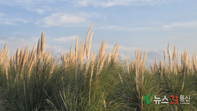 ▲ 해안 언덕에 자생한 팜파스그라스가 가을 햇살을 받아 황금빛으로 물들고 있다.