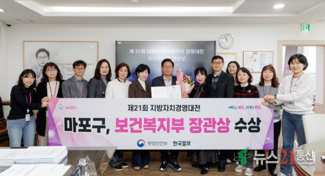 마포구(구청장 박강수)는 행정안전부와 한국일보가 공동 주최한 제21회 대한민국 지방자치 경영대전에서 우수상인 ‘보건복지부 장관상’을 수상하는 쾌거를 이뤘다.