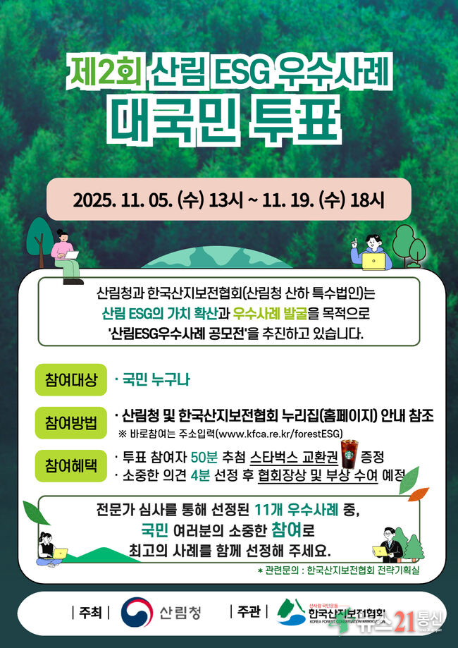 산림청(청장 김인호)은 오늘(5일)부터 국내기업 및 공공기관의 산림분야 환경·사회공헌·투명경영(ESG) 우수사례 선정을 위한 온라인 국민투표를 진행한다고 밝혔다.