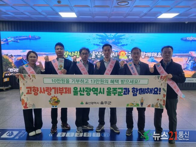 [뉴스21 통신=최세영 ] ▲ 사진제공=울주군청울산 울주군이 7일 KTX동대구역에서 이용객을 대상으로 울주군 고향사랑기부제와 지역 주요 관광지 홍보 캠페인을 실시했다.이날 캠페인에 참여한 울주군 행정지원국장 및 세무과 직원들은 동대구역 이용객에게 고향사랑기부제를 홍보하고, 울주군 주요 관광지를 소개했다....