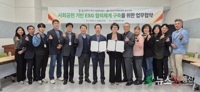 [뉴스21 통신=최병호 ]*사진출처-울산북구청❍ 울산광역시북구시설관리공단(이사장 임정식)은 11월 10일 공단 회의실에서 (사)시니어벤처협회 울산지회(회장 이이경)와 ‘사회공헌 기반 ESG 협력체계 구축을 위한 업무협약’을 체결했다.❍ 이번 협약은 공공기관과 민간단체 간 협력체계를 구축해 정기적인 사회공헌활동을 제도화하고, ...
