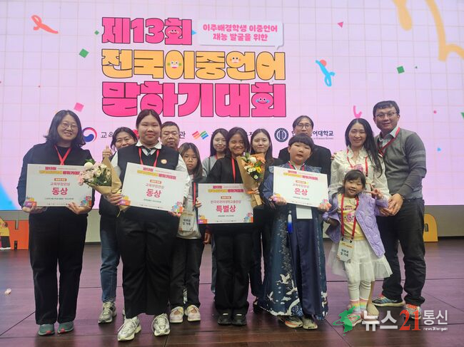 [뉴스21 통신=최세영 ]▲ 사진제공=울산광역시교육청울산광역시교육청(교육감 천창수)을 대표해 제13회 전국이중언어말하기대회에 참가한 학생 3명(초등부 1명, 중등부 2명)이 모두 수상했다. 교육부가 주최하고 국가평생교육진흥원, 한국외국어대학교가 주관한 이번 대회는 지난 8일 서울 마곡 LG사이언스파크에서 열렸다. 17개 시...