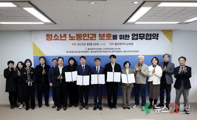 [뉴스21 통신=최세영 ]▲ 사진제공-울산광역시교육청울산광역시교육청(교육감 천창수)은 12일 오후 2시 접견실에서 관계 기관과 울산지역 청소년의 노동 권익 보호와 노동환경 개선을 위한 업무협약을 맺었다. 협약에는 (사)한국공인노무사회, 북구비정규직노동자지원센터, 울산광역시동구비정규직노동자지원센터, 울산근로자이음센터...