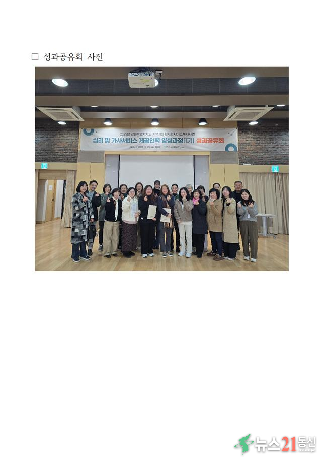 □ 강원특별자치도 사회서비스원(원장 이은영) 소속 강원지역사회서비스지원단은 도내 지역자율형 사회서비스 투자사업의 심리 및 가사서비스 분야 제공인력 양성과정의 성과를 공유하는 자리를 마련했다.