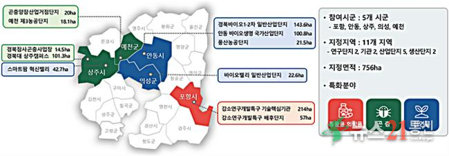 지역은 포항·안동·상주·의성·예천 5개 시군이며 포항강소연구개발특구 등 총 11개 기관과 산업단지로 면적은 총 756ha로 전국 최대 규모다.