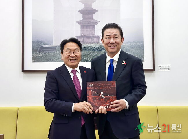 백서 광주, 광장의 시간들 전달 (사진=광주광역시)[뉴스21통신/장병기] 강기정 광주광역시장이 2일 국회에서‘광주, 광장의 시간들’이라는 백서를 주요 정치인들에게 전달하며 윤석열 대통령의 비상계엄 선포에 맞선 시민사회와 광주시의 공동 대응 기록을 공개했다.
