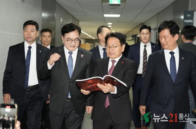 이날 국회 본관에서 강 시장은 우원식 국회의장, 정청래 더불어민주당 대표, 김병기 원내대표, 김민기 국회 사무총장 등 주요 인사들을 차례로 만나 백서를 전달했다. 각 전달 순간은 광주광역시 제공 사진으로 기록됐다.