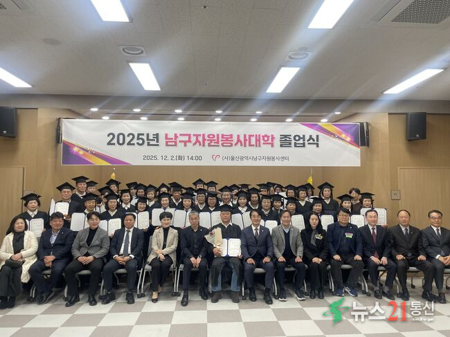 남구자원봉사센터(이사장 최영수)는 2일 남구자원봉사센터 대강당에서 2025년 남구자원봉사대학 제1기 졸업식을 개최하고 지역사회 봉사활동을 이끌어갈 신규 자원봉사 리더 70여 명을 배출했다.