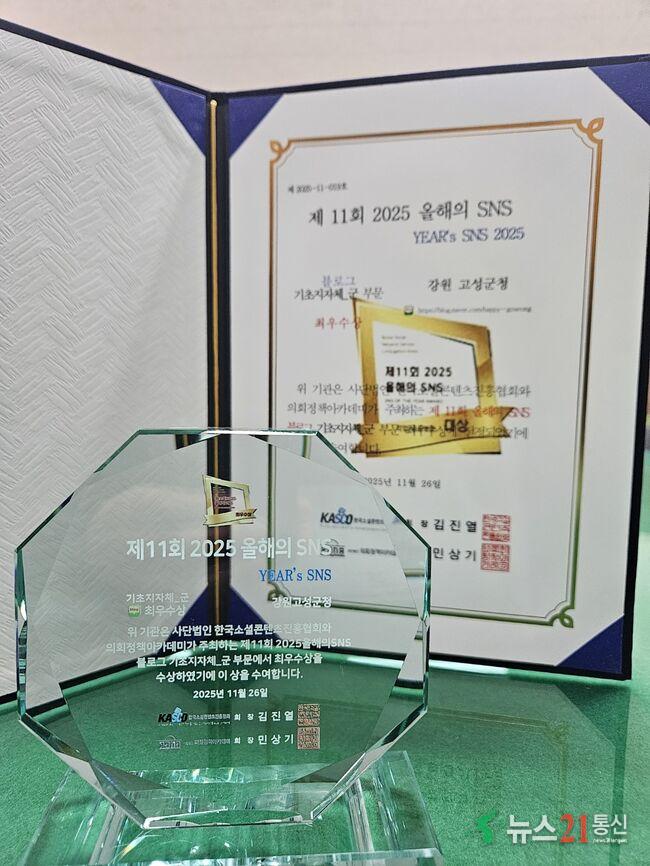 강원 고성군은 사단법인 한국소셜콘텐츠진흥협회가 주관한 ‘제11회 2025 올해의 블로그’ 기초지자체 부문에서 최우수상을 받았다.
