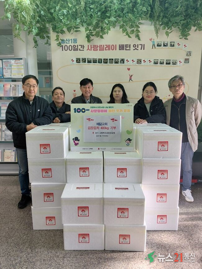의정부시 송산1동주민센터(동장 전선녀)는 12월 1일 예닮교회(담임목사 이명현)로부터 관내 취약계층 지원을 위해 김장김치 400kg을 기탁받았다. 이번 김치는 예닮교회 성도들이 직접 담가 독거노인과 저소득 가구에 전달될 예정이며, 예닮교회는 국수 나눔, 정기 후원, 봉사활동 등으로 지역 복지 향상에 꾸준히 기여하고 있다. 이명현 담임목사는 “추운 겨울 어려운 이웃들이 따뜻함을 느끼길 바란다”고 전했으며, 전선녀 동장은 “성도분들의 정성을 소중히 전달하겠다”고 밝혔다. 이번 나눔은 겨울철 지역사회의 나눔 문화 확산과 취약계층 지원에 의미 있는 사례로 평가된다.