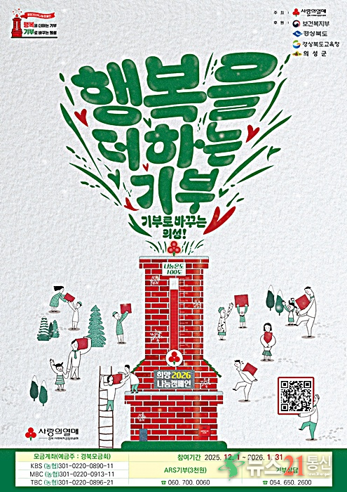 의성군(군수 김주수)은 지난 1일부터 2026년 1월 31일까지 약 62일간 ‘행복을 더하는 기부, 기부로 바꾸는 의성’을 슬로건으로 「희망2026 나눔 캠페인」을 전개한다고 밝혔다.