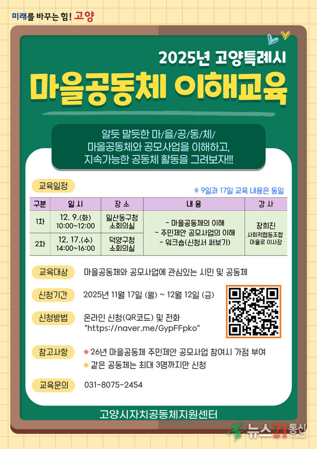 고양특례시(시장 이동환)는 시민들의 마을공동체 활동에 대한 이해도와 참여를 높이기 위해 오는 12월 9일과 17일, 두 차례에 걸쳐 ‘2025년 마을공동체 이해교육’을 진행한다고 밝혔다.