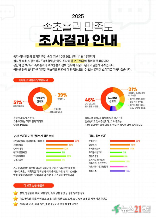콘텐츠 만족도는 전 항목에서 개선됐으며, 기획 콘텐츠 ‘라이프인속초’ 등과 생활 정보 코너가 특히 호응을 얻었다.