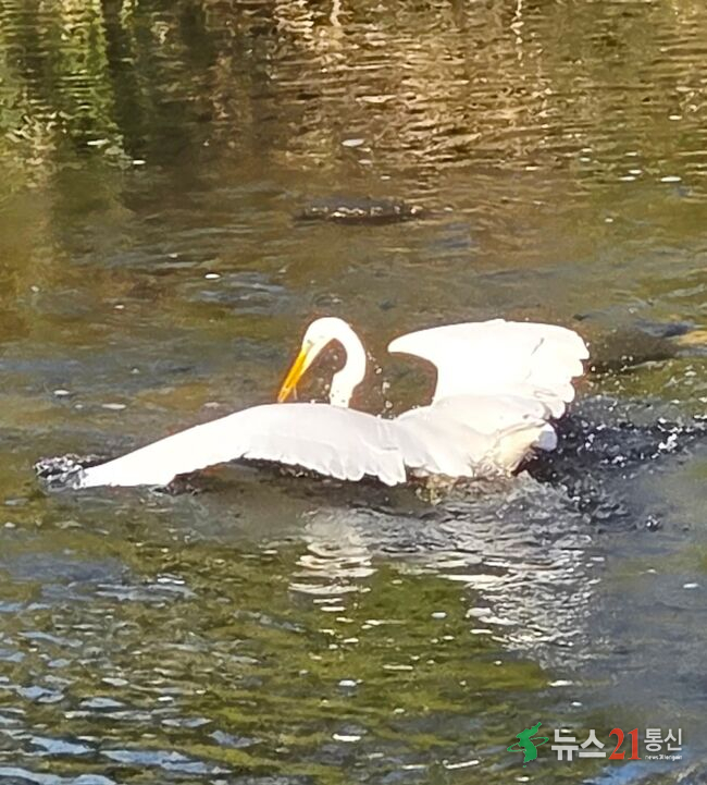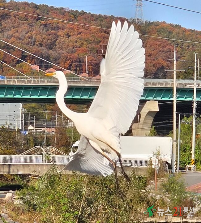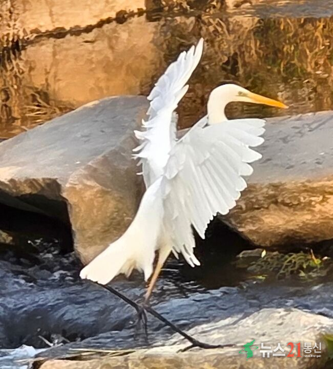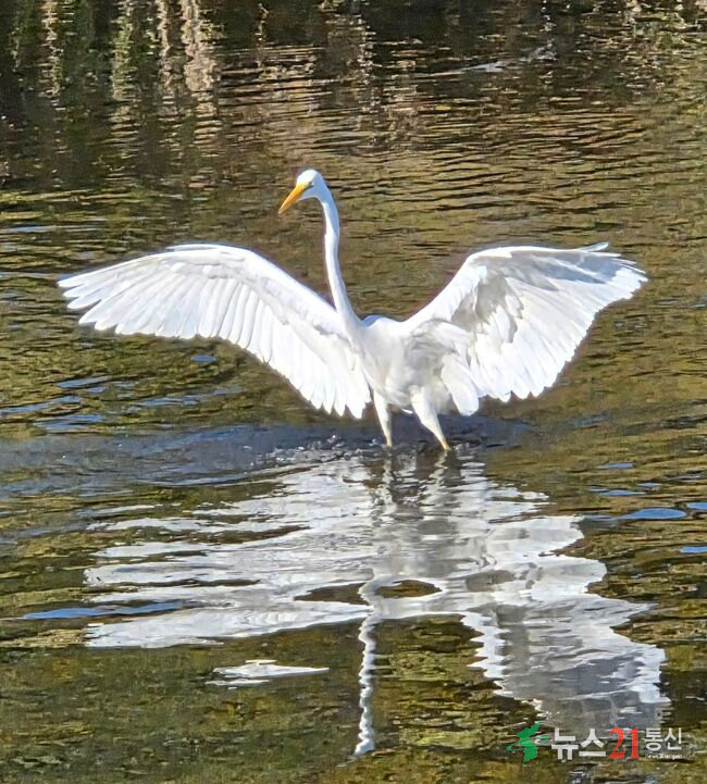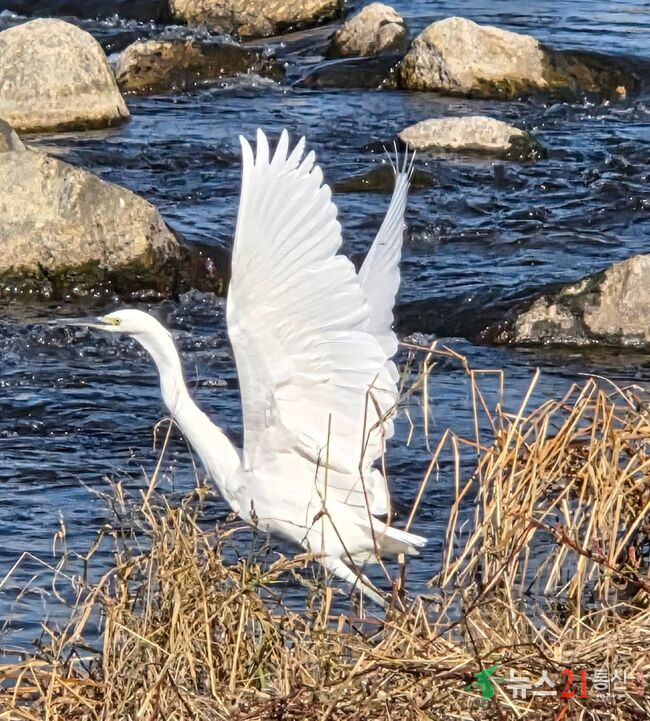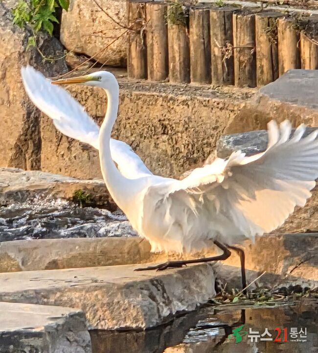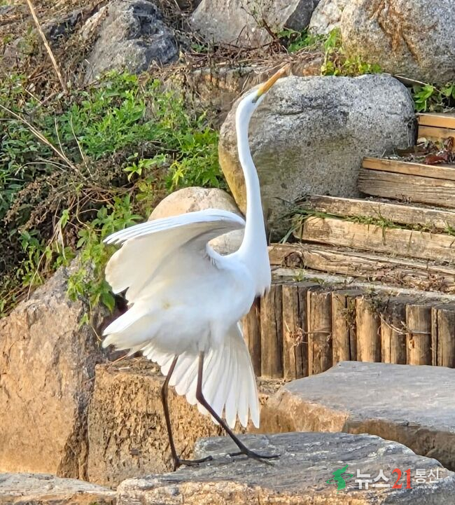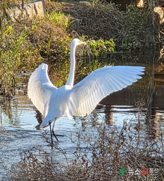 왜가리는 황새목 왜가리과에 속하는 큰 새로, 몸길이는 약 90~100cm 정도이다. 몸은 흰색이고, 목과 다리가 길며, 부리는 날카롭고 길어 물고기와 작은 동물을 잡아먹는다.