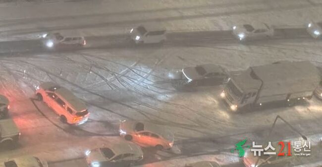 언덕길에서는 빙판에 갇힌 차량들이 줄줄이 멈춰섰고, 승합차 충돌로 도로가 막히는 등 곳곳에서 사고가 이어졌다.