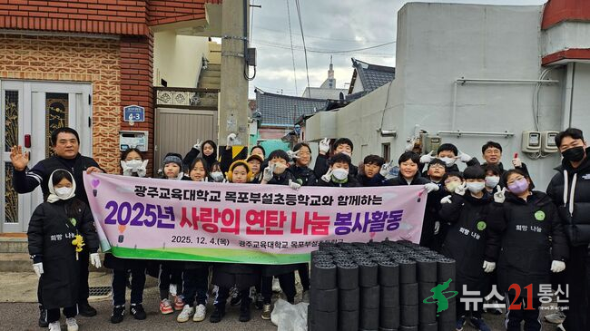 [뉴스21 통신=박민창 ] 용당2동 행정복지센터가 지난 4일 광주교육대학교 목포부설초등학교 학생들과 함께 겨울철 난방이 어려운 취약계층을 위한 연탄 나눔 봉사활동을 펼쳤다.