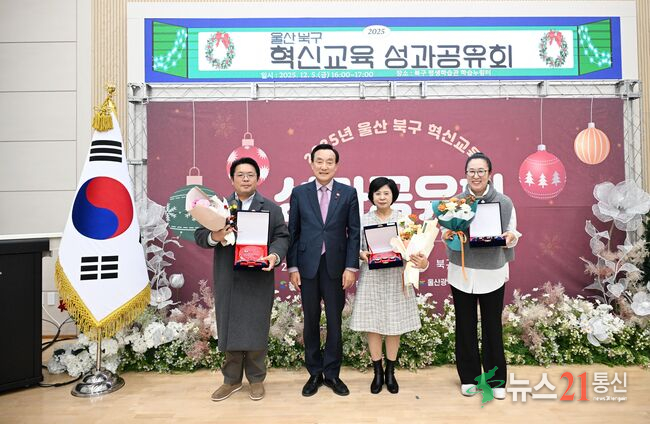 박천동 북구청장이 5일 북구평생학습관에서 열린 2025 혁신교육 성과공유회에서 혁신교육 유공자에게 표창패를 전달한 후 기념촬영을 하고 있다.