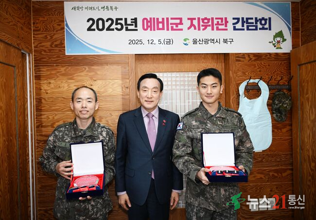 박천동 북구청장이 6일 지역의 한 식당에서 열린 2025년 예비군 지휘관 간담회에서 예비군 육성지원 유공자에게 표창패를 수여한 후 기념촬영을 하고 있다.