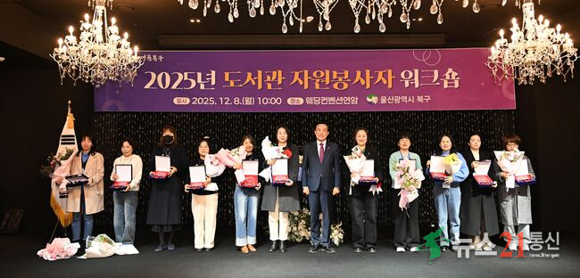 박천동 북구청장이 8일 연암컨벤션에서 열린 도서관 자원봉사자 워크숍에서 도서관 활동 유공자에게 표창패를 수여한 후 기념촬영을 하고 있다.