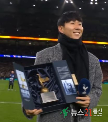 작별 인사 후 토트넘 레전드 레들리 킹이 수탉 모양 트로피를 전달했고, 손흥민은 감정에 벅찬 듯 눈시울을 붉혔다.