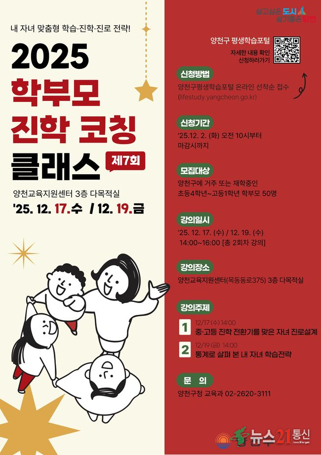 한편, 양천구는 ‘학부모 진학 코칭 클래스’를 지난해 7회에서 올해 13회로 확대해 운영하고 있으며, 양천교육지원센터를 중심으로 평생학습관, 동 주민센터 등 권역별 거점 공간에서 다양한 주제의 순환 강의를 진행해 높은 호응을 얻고 있다.