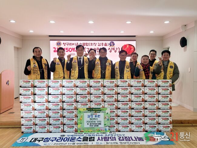 (뉴스21통신) 권혜선기자 = 국제라이온스 356-A 대구지구 제4지역 청구라이온스 클럽(회장: 김홍출)이 지난 9일 지역사회의 어려운 이웃들에게 따뜻한 사랑을 전하는 김장 나눔 봉사활동을 진행했다. 청구라이온스 김홍출 라이온과 네스 20여 명은 아침부터 김치 150박스를 정성껏 담갔으며, 이를 봉덕3동 저소득 가구에 전달하며 지역사회를 위한 나눔의 손길을 내밀었다.