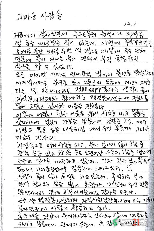 최근 북구2동 행정복지센터에 찾아가는 보건복지팀과 지역사회보장협의체의활동에 고마움을 전하는 감사편지가 도착했다.