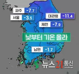 대관령은 영하 11도, 파주는 영하 8도 안팎, 서울은 영하 3.5도로 체감온도는 더 낮았다.