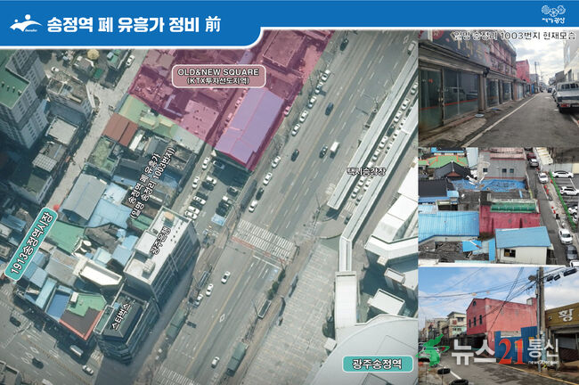 [뉴스21통신/장병기 기자] 광주 광산구가 광주송정역을 호남 관문다운 공간으로 변화시키기 위해 광장 확장 사업에 이어 오랜 난제로 방치된 역 맞은편 폐 유흥가 일대(일명 송정리 1003번지)를 시민 공간으로 전환하는 공공 주도 정비 사업을 추진한다.단순히 낡은 건물을 철거하는 데 그치지 않고, 특색 있는 공간 활용 전략을 바탕으로 광주...