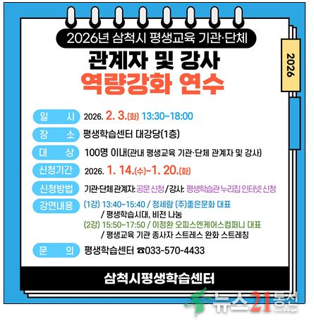 삼척시는 2026년 평생교육 기관·단체 관계자와 강사를 대상으로 촘촘한 교육복지 실현을 위한 역량강화 연수를 개최한다고 밝혔다.