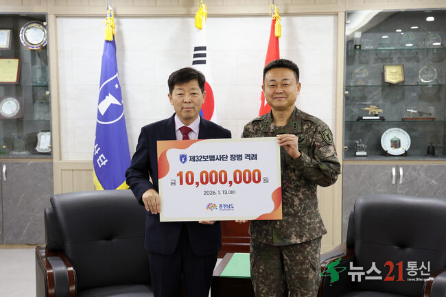 충남도는 1월 13일 육군 제32보병사단을 방문해 박정주 행정부지사 등 도 방문단이 위문금과 위문품을 전달하고 군 관계자와 장병들을 격려했다.