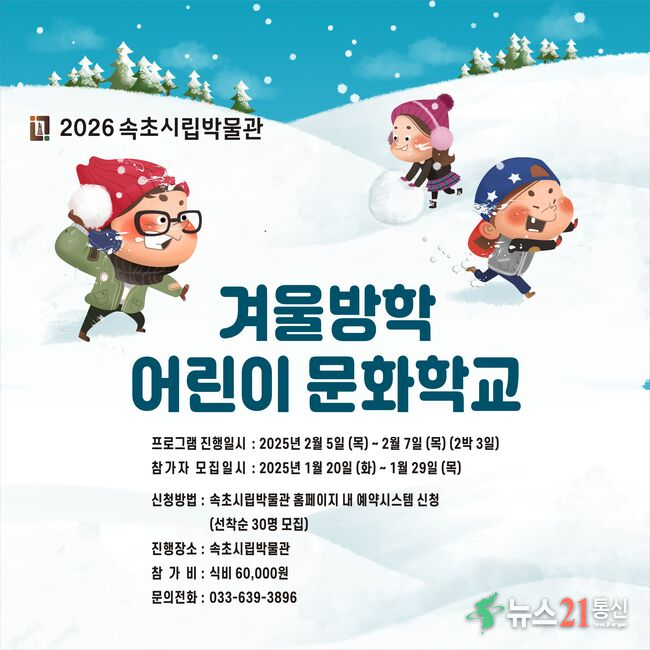 속초시립박물관이 어린이들이 겨울방학 기간 다양한 문화교육 활동을 즐길 수 있도록 ‘2026 겨울방학 어린이 문화학교’를 2월 5일(목)부터 2월 7일(토)까지 2박3일 일정으로 운영한다.