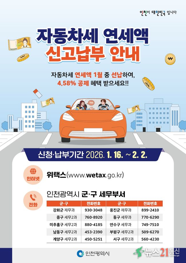 신청 대상은 2026년 1월 1일 기준 인천시 등록 자동차 소유자이며, 관할 군·구 세무부서 방문, 전화 접수, 위택스 누리집과 ‘스마트 위택스’ 앱을 통한 온라인 신청이 모두 가능하다. 기존 연납 이용자는 별도 신청 없이 공제 세액이 반영된 고지서를 받을 수 있으며, 미납 시에도 6월과 12월 정기분에 맞춰 원래 세액을 납부하면 된다.