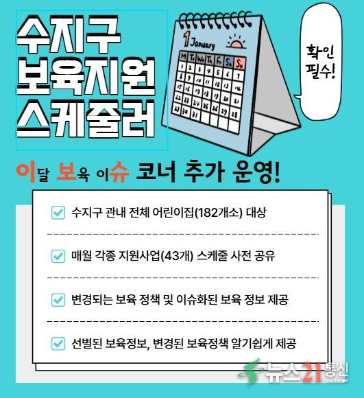 용인특례시(시장 이상일) 수지구는 보육 정책 등을 알기 쉽게 정리한 ‘보육지원 스케줄러’에 이달 보육 이슈 항목을 신설했다고 15일 밝혔다.