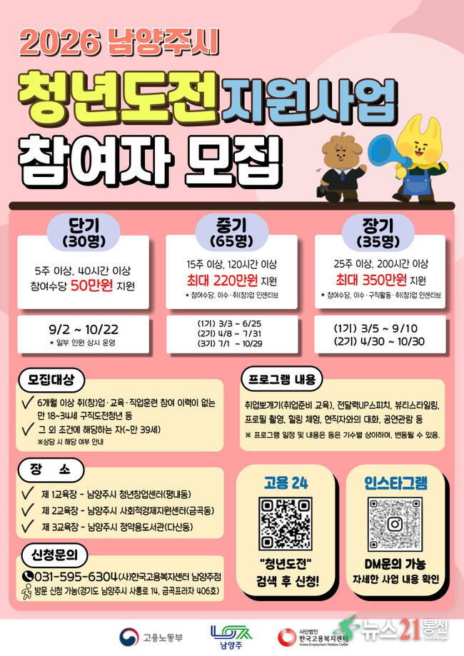 신청은 ‘고용24’ 누리집 또는 전단 포스터에 안내된 큐알(QR)코드를 통해 가능하며, 자세한 문의는 (사)한국고용복지센터 남양주점(031-595-6304)로 하면 된다.