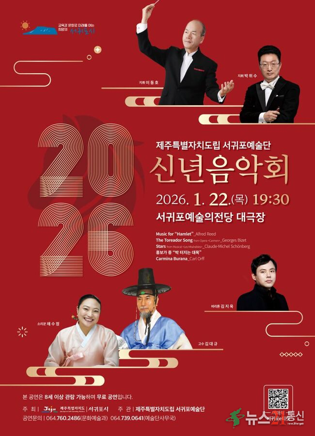 서귀포시는 1월 22일 오후 7시 30분 서귀포예술의전당 대극장에서 ‘제주특별자치도립 서귀포예술단 2026 신년음악회’를 연다.