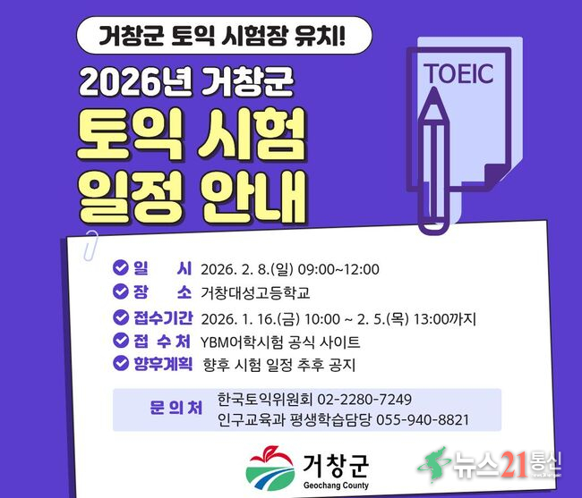 [뉴스21 통신=김희백 ] 거창군이 토익시험장을 유치하며 교육도시로서의 위상을 한층 강화하고 있다.