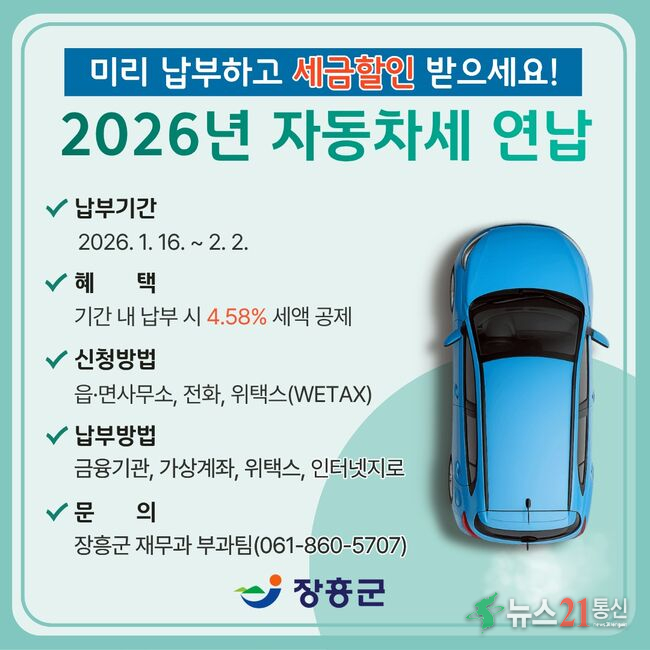 장흥군은 15일 2026년도 자동차세 연납 고지서를 장흥군에 등록된 모든 차량 소유자에게 일괄 발송했다고 밝혔다.