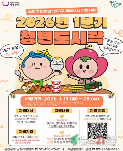 사업 대상은 광진구에 주민등록을 둔 19~39세 미취업 청년 1인 가구로, 올해는 분기별 100명씩 총 400명을 선정해 정기적으로 식사를 제공한다고 전했다.