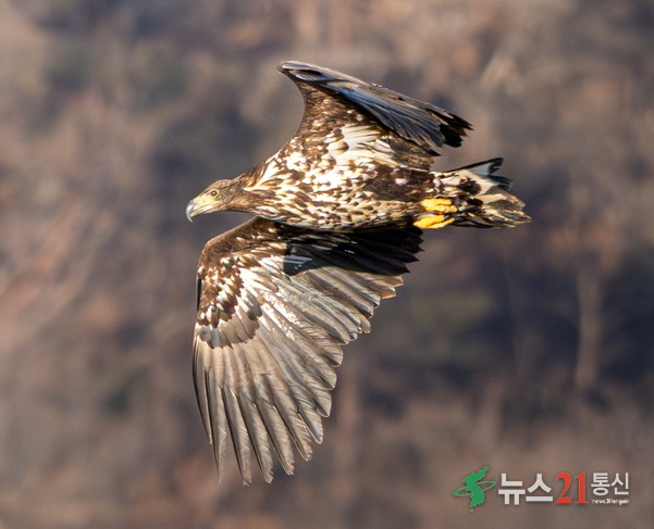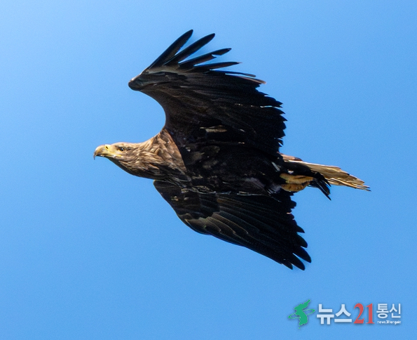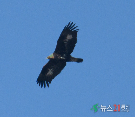 관찰된 검독수리는 날개깃 기부에 흰색 반점이 있고 꼬리가 흰색으로 확인돼 어린 새로 파악됐다.