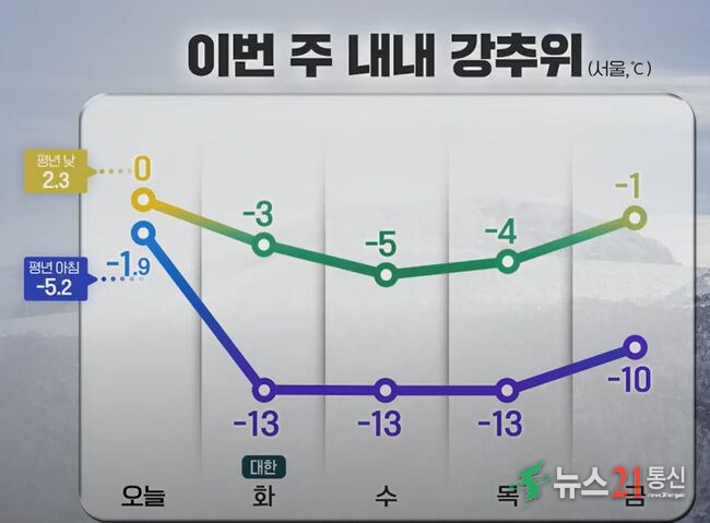 주 후반까지도 서울을 비롯한 중부 지방의 낮 기온이 영하 10도를 밑도는 강한 추위가 이어지며, 영남 지방에는 여전히 건조 특보가 발효 중이고 바람이 매우 강하게 불 것으로 예상된다.