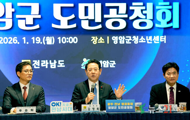 영암군 광주·전남 행정통합 도민공청회[뉴스21통신/장병기 기자] 전라남도는 19일 오전 광주·전남 행정통합에 대한 도민 의견을 폭넓게 수렴하기 위해 영암군 청소년센터 대강당에서 첫 도민공청회를 열어 추진 방안과 특례 내용 등을 설명하고 도민의 의견을 귀담아들었다.