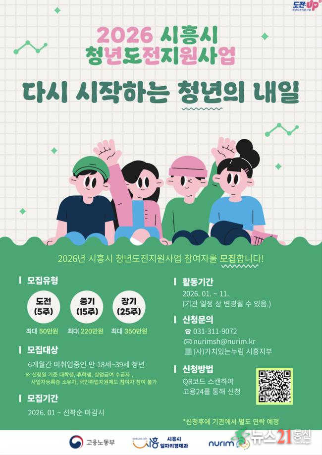 시흥시는 취업과 사회 진출에 어려움을 겪고 있는 청년들의 재도전을 지원하기 위해 ‘2026년 청년도전지원사업’ 참여자 156명을 모집한다.