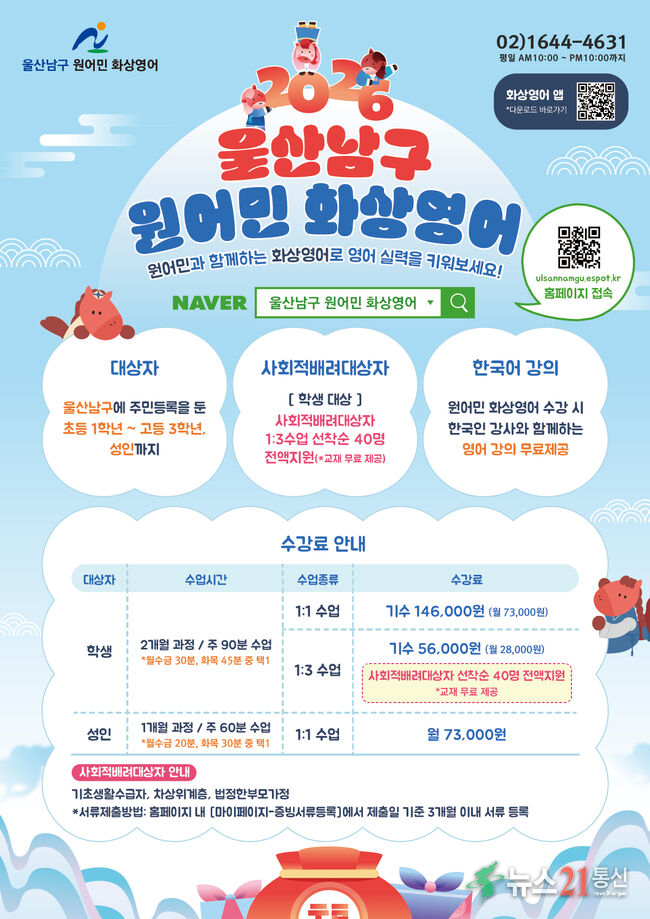 울산 남구(구청장 서동욱)는 2026년 행복남구 미래교육지구사업의 일환으로 사회적배려대상 초·중학생 200명에게 원어민 화상영어 수강권을 전액 무료 지원한다고 밝혔다.